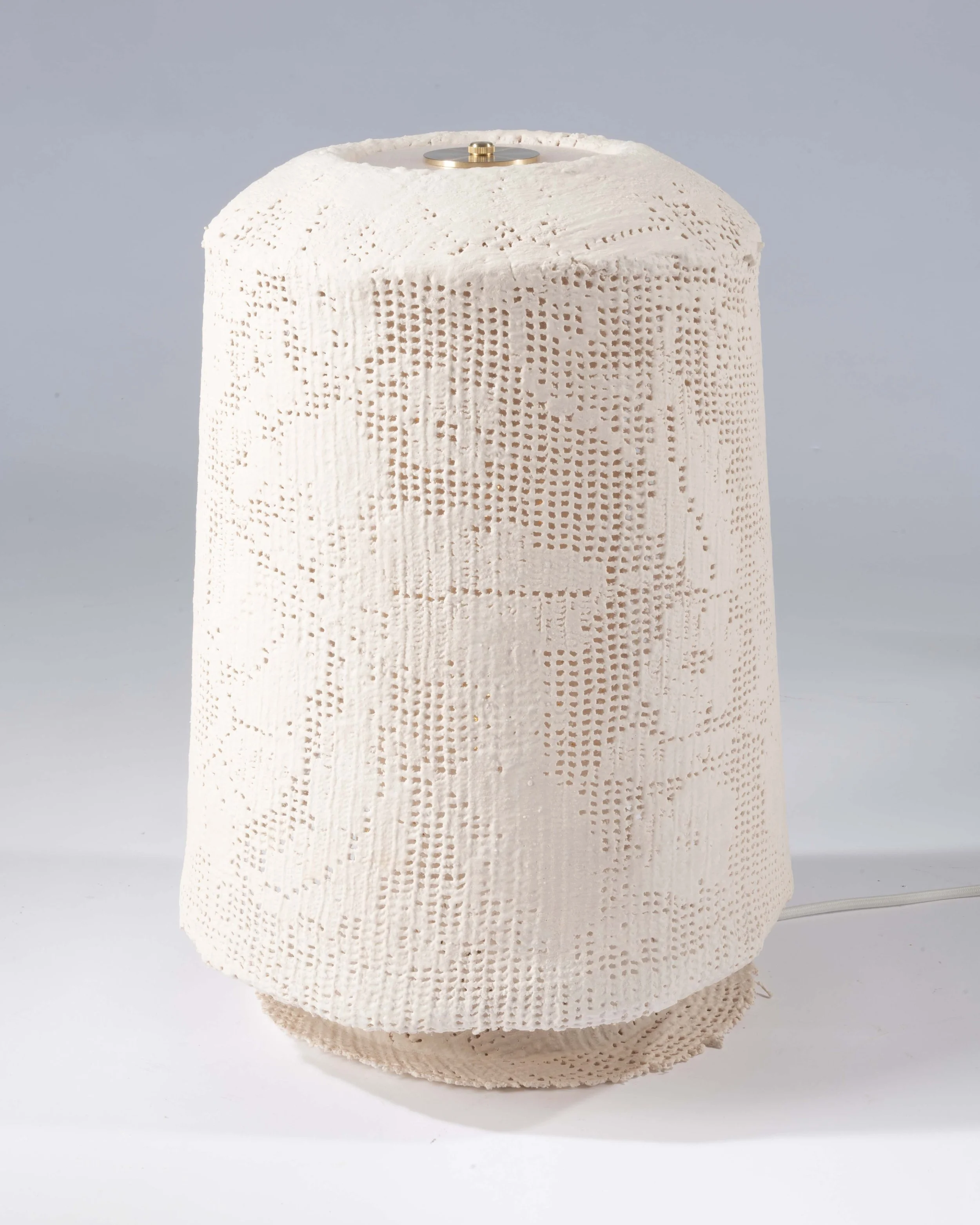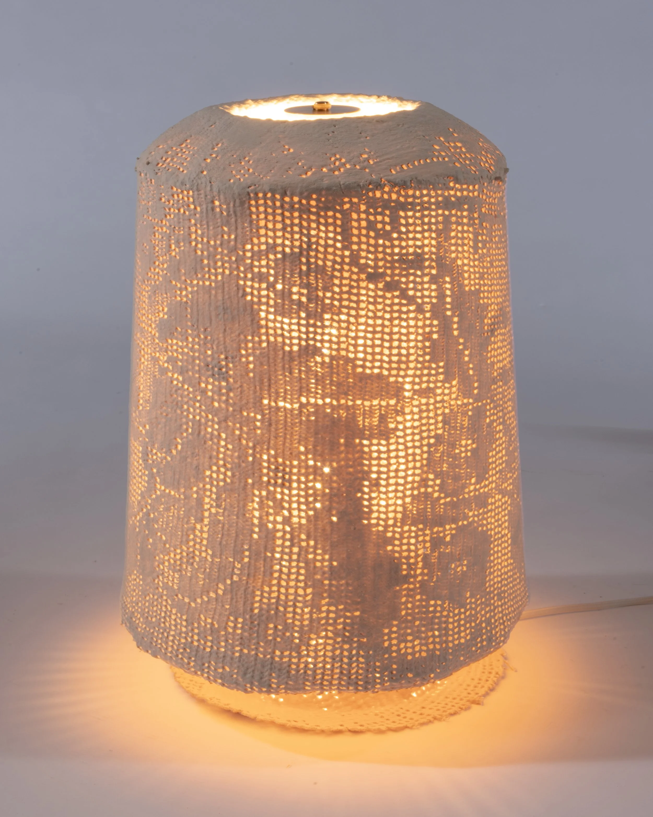 A single lace table runner is patterned into a continuous slip and stretched over a form, transforming a familiar domestic textile into a volumetric object. The delicate, two-dimensional material is hardened with resin, fixing its softness into a permanent structure while preserving its intricate detail.