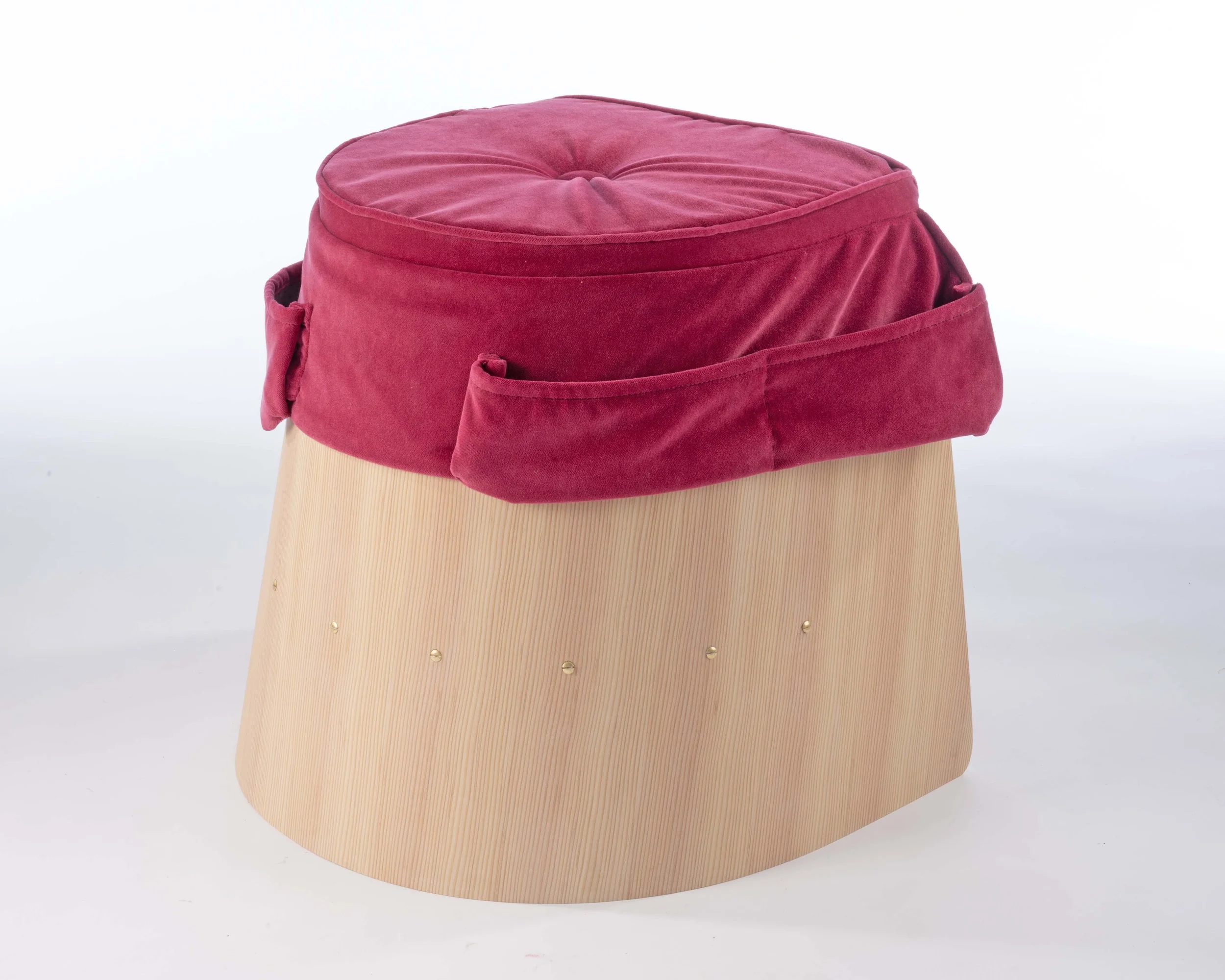 These pockets act as both a practical and symbolic gesture, referencing traditions of care and labor, where tools are kept close to the body and within reach. By incorporating them directly into the structure, the stool blurs the boundary between utility and adornment, positioning work as something visible and valued rather than concealed.