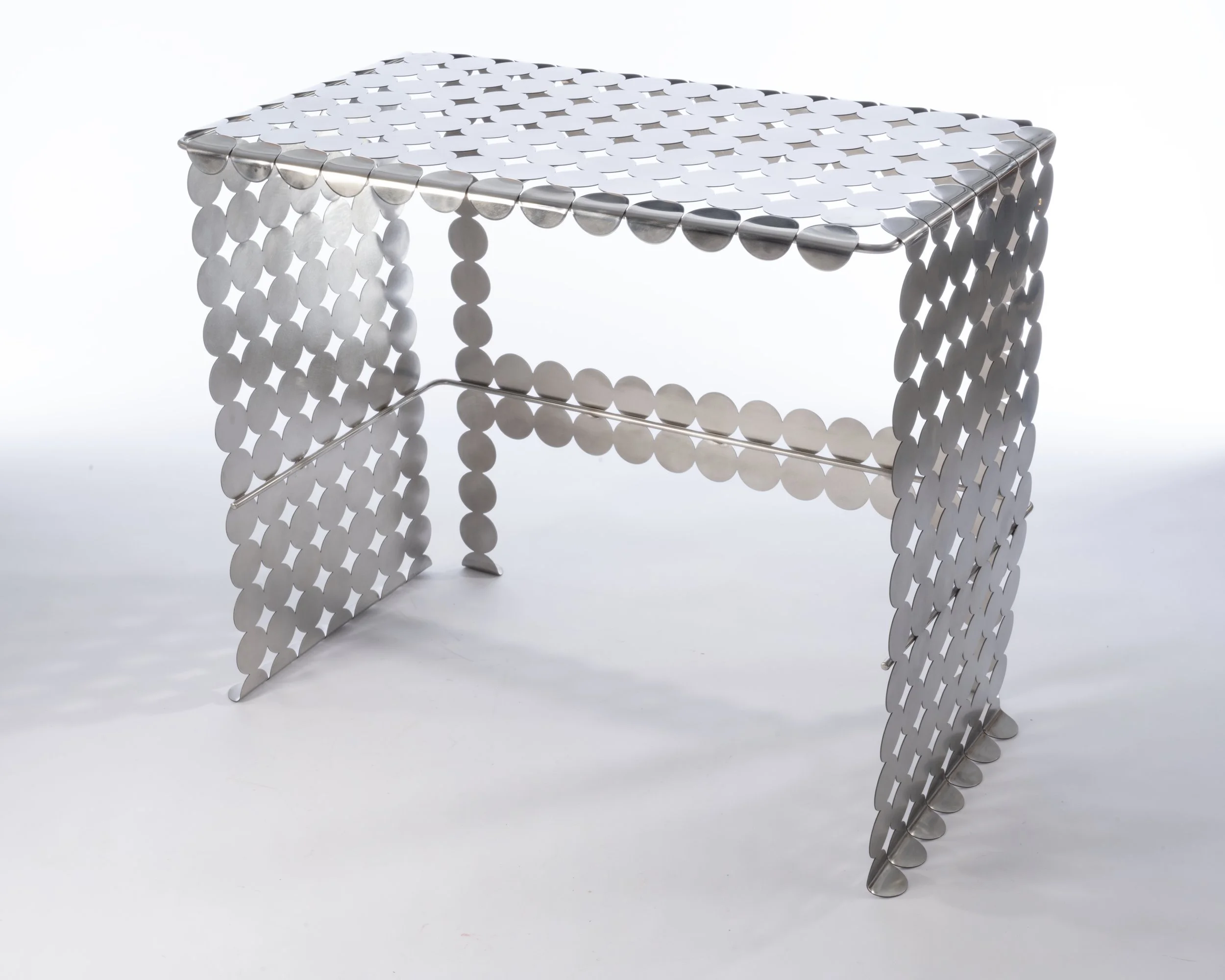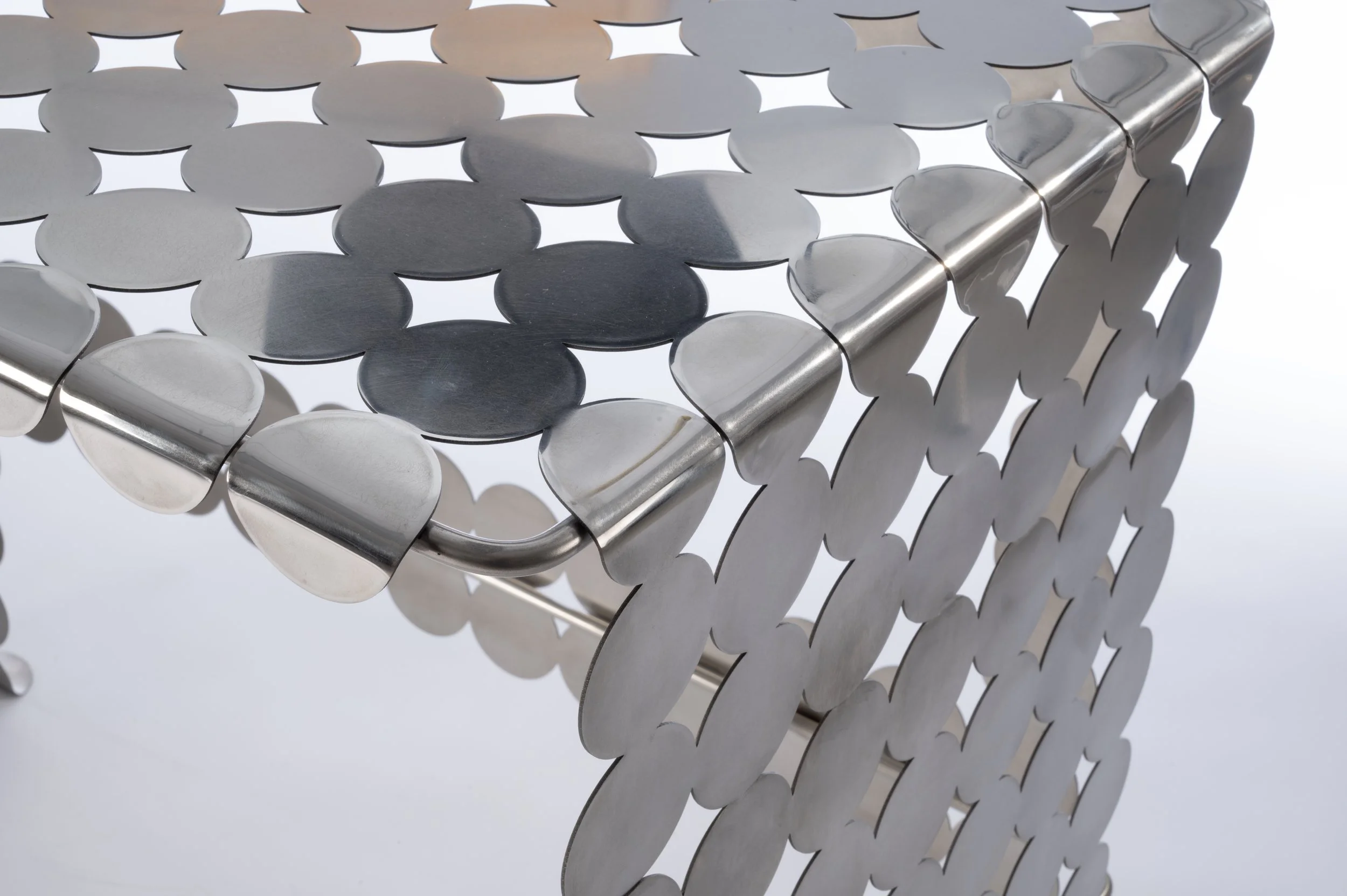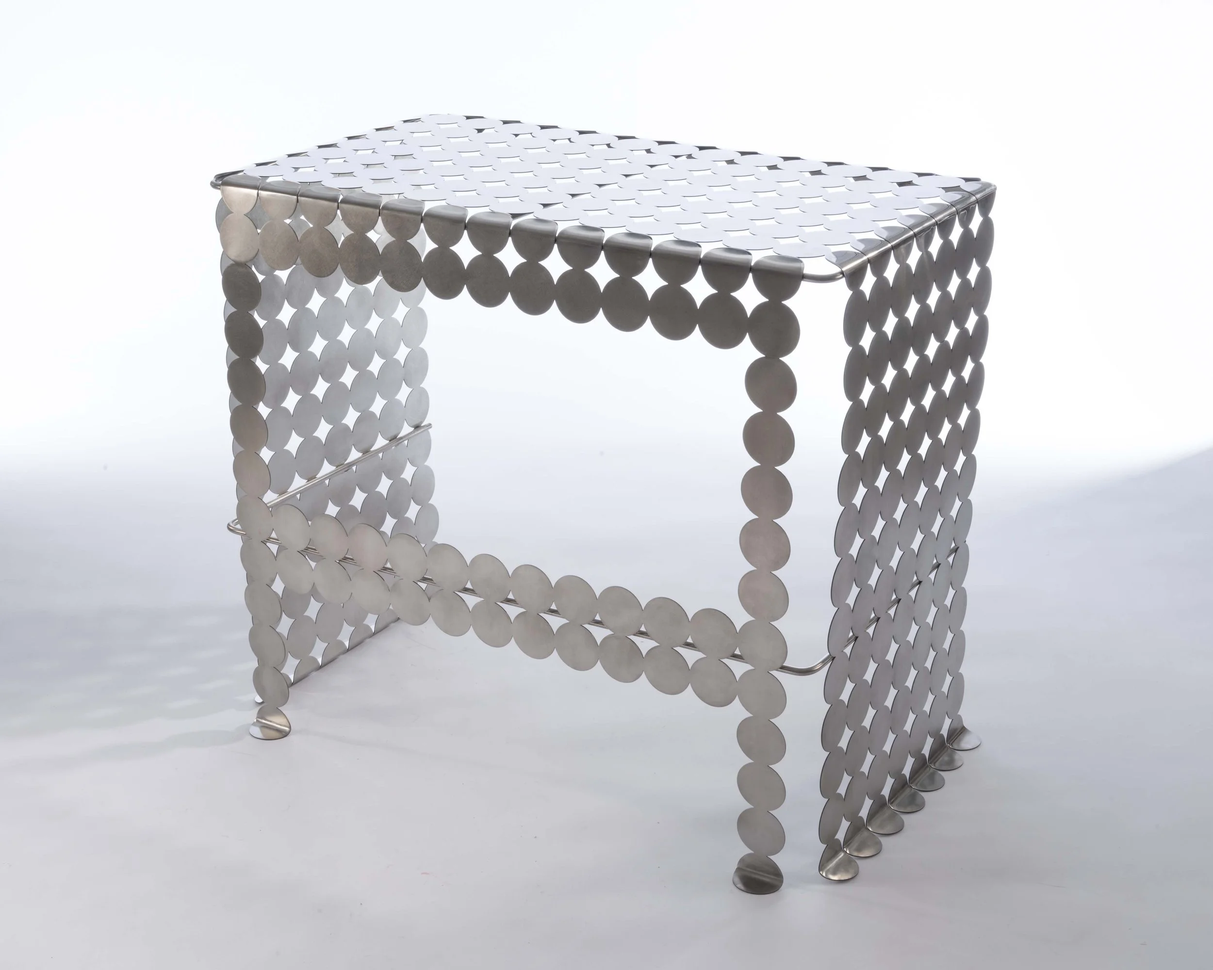 The pointe vanity set is inspired by the metal disk dresses from Paco Rabanne’s 12 Unwearable Dresses collection. To me this dress represents a sort of feminine armor, and is a nod to how fashion has historically influenced women’s tastes. Through my focus on the vanity, I am taking an already gendered piece of furniture and attempting to infuse it with the power of Rabanne’s dresses, in which the wearer feels the power of these small discs simultaneously revealing and shielding. Its provocative and was extremely unexpected for the 1960s.